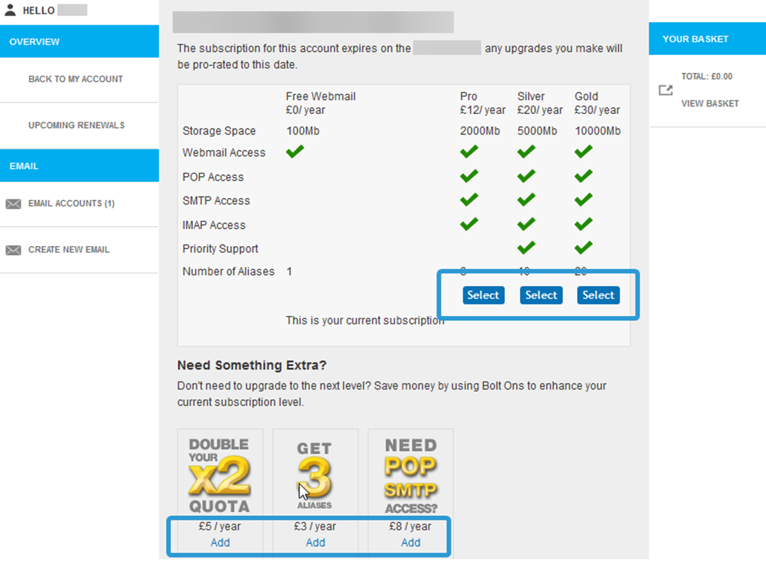 Once selected, the Packages and Bolt-Ons will be added to your Basket. You can click on Basket or Checkout to view details of the upgrades you have selected and continue with upgrading your Account.