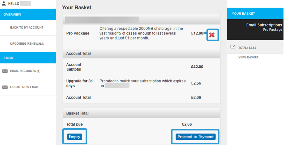 Your Basket will show all the Packages and Bolt-Ons you have selected, and show the total amount due for the upgrade. This is calculated on a pro rata basis to match your renewal date. Click on Proceed to Payment if you wish to continue with your upgrade. Alternatively, you can click Empty to clear your basket or remove any items in your basket using the small red cross next to the item.